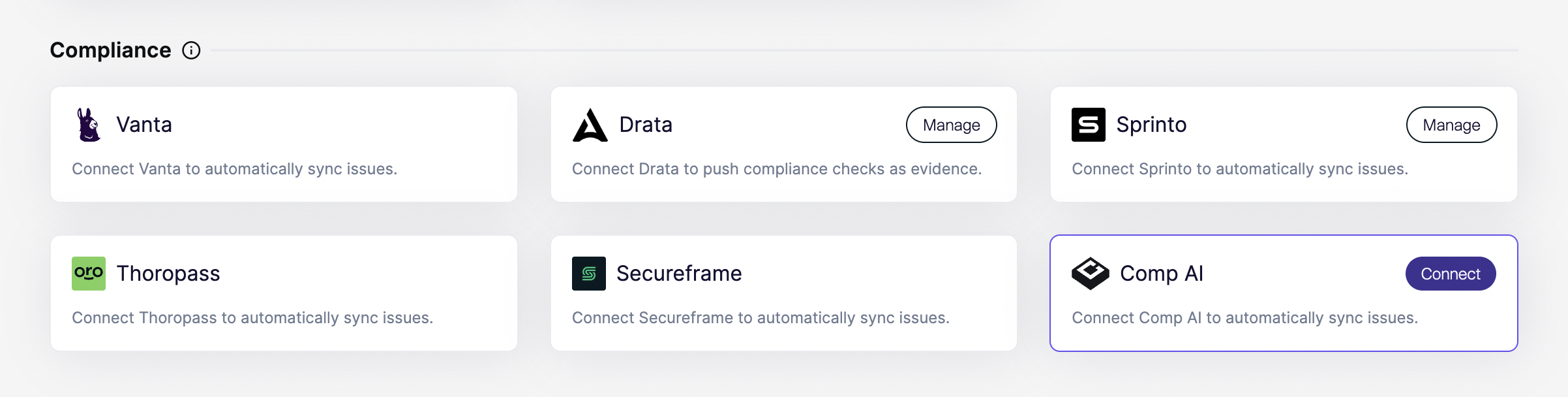 合気道 Aikidoでは、コンプライアンスを優れたセキュリティの副産物として捉え、チームが別途準備すべき独立した活動とは考えてきませんでした。だからこそ Aikido は複数のコンプライアンスプラットフォームと連携します。目的は単純明快です:チームが Aikido で生成されたセキュリティデータを、コンプライアンスプログラムを運用するあらゆる場所で、作業方法や並行プロセスの維持を変更することなく利用できるようにすることです。